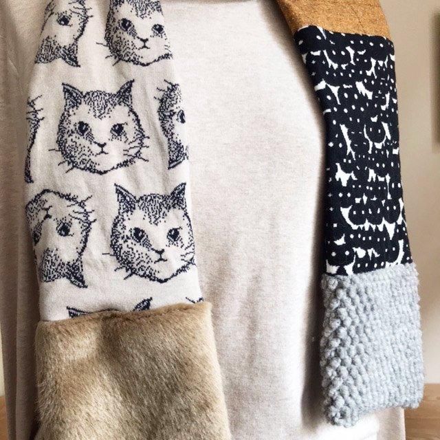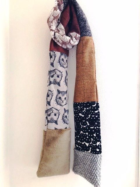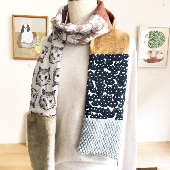 ハイジオリジナルのマフラーです。何種類かの素材や柄違いを組み合わせて楽しく使えるマフラーに仕上がりました。