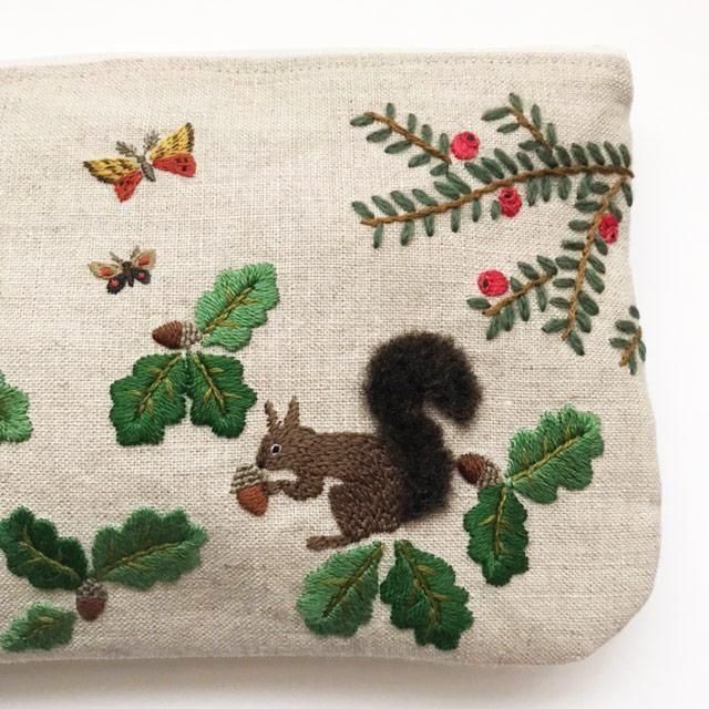 リスの楽しげな様子が描かれ、とても丁寧な刺繍が施されています。