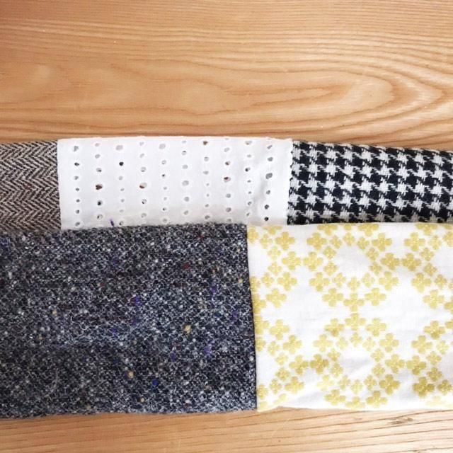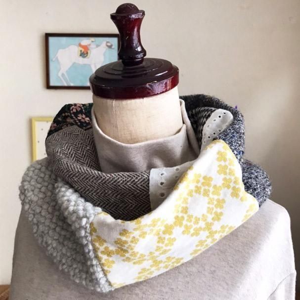 いろんな素材や柄違いを組み合わせてスヌードに仕上がりました。