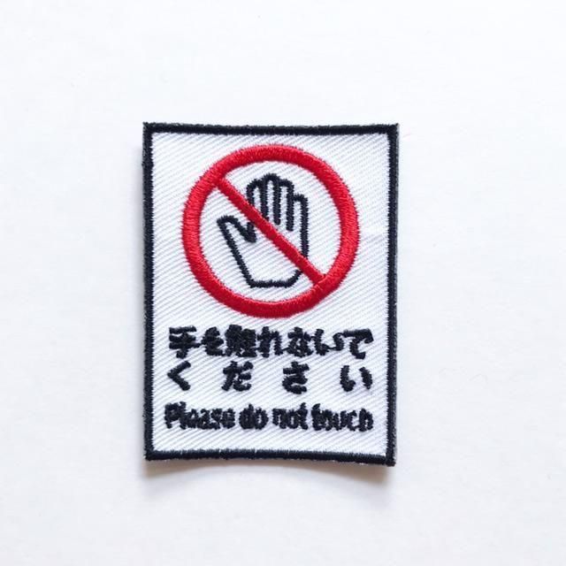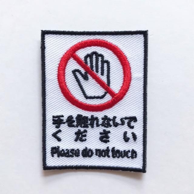 注意書きの看板「お手に触れないでください」がワッペンに。
